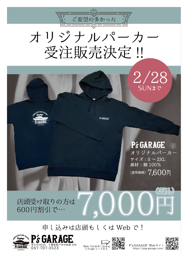 お客様からたびたびご要望をいただいていた、スタッフが着用しているP’s GARAGEのロゴ入りのパーカーを…この度、受注生産で販売することが決まりました!!!